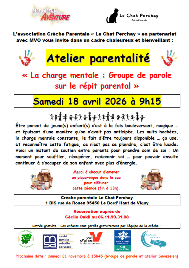 Vous êtes cordialement invités à l’atelier parentalité du samedi 18 avril 2026 à 9h15 à la crèche de VIGNY.